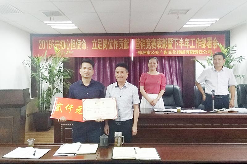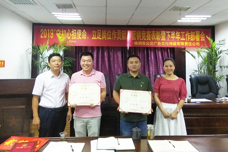 會(huì)議現(xiàn)場(chǎng)謝總與廣告公司領(lǐng)導(dǎo)班子分別對(duì)上半年業(yè)績(jī)達(dá)標(biāo)的業(yè)務(wù)二部、設(shè)計(jì)和制作部以及業(yè)績(jī)突出的營(yíng)銷員周奇軍進(jìn)行了表彰頒獎(jiǎng),同時(shí)鼓勵(lì)全司員工學(xué)習(xí)先進(jìn),再接再厲,立足崗位作出新貢獻(xiàn)。
